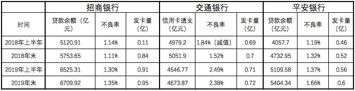 信用卡发卡量的增长也出现疲软。截至2019年年末,招商银行、交通银行、平安银行分别累计发卡0.95亿、0.72亿、0.6亿张。