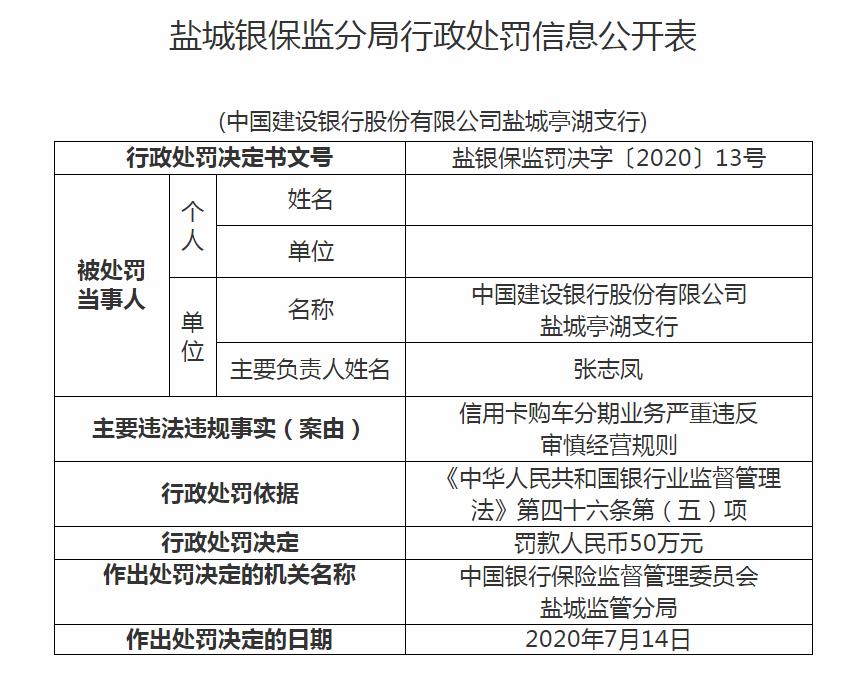 编号为盐银保监居居居字[2020]13号的罚单显示,中国建设银行盐城亭湖支行的主要违法事实是信用卡购车分期业务严重违反审慎经营规则。中国保监会盐城分行作出处罚决定的日期为7月14日。