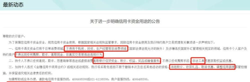 公告已经说得很明确了,重点立哥也勾勒出来了,信用卡资金仅用于消费,不得用于购房、投资、生产经营等非消费领域。