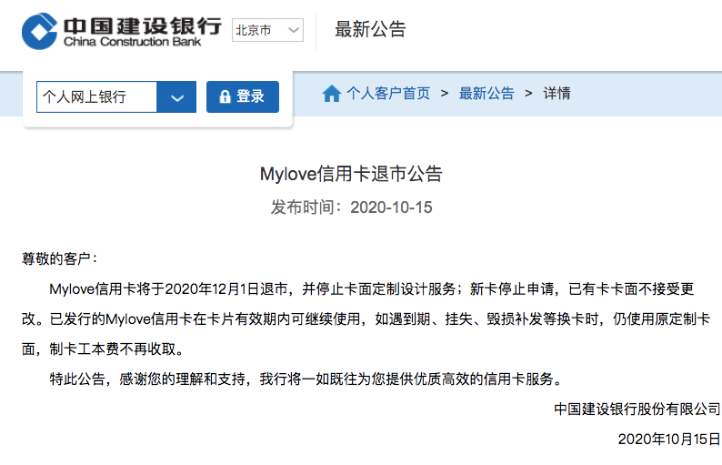 10月15日,建设银行信用卡官网连续发布了两条最新公告,公告涉及龙卡汽车卡积分与Mylove信用卡相关问题。