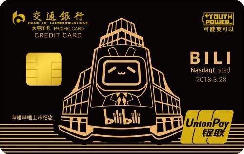 10月9日,交通银行信用卡携手bilibili推出首张bilibili主题信用卡,此卡隶属于交通银行信用卡Y-POWER系列,是交通银行专门为泛二次元群体打造的信用卡, 旨在夯实交通银行信用卡“品牌年轻化”战略,丰富交通银行信用卡Y-POWER产品体系。