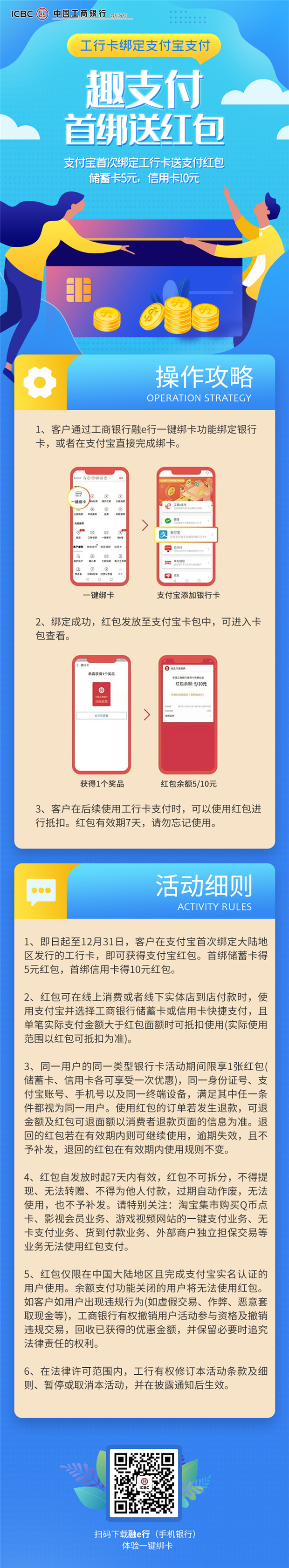 支付宝首绑工行卡送支付红包!储蓄卡5元、信用卡5元
